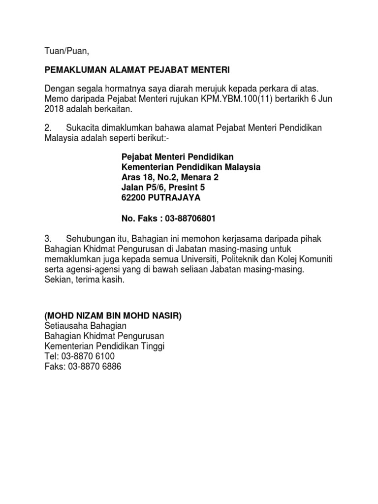 Kpm Notis Pemakluman Alamat Sekretariat Pmo Dasar Pendidikan Digital Kementerian Pendidikan Malaysia